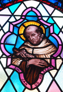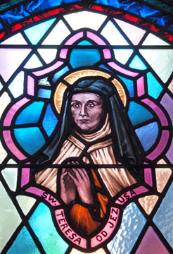 There are depictions of St. Teresa of Jesus (1515 - 1582) and St. John of the Cross (1542 - 1591) on the altar. These saints renewed the Carmelite Order in 16th Century Spain giving rise to its new branch, the Discalced Carmelites; therefore in our communities we consider them "spiritual parents." Their images are also displayed in stained glass, on which you can also see St. Therese of the Child Jesus, the Sacred Heart of Jesus, and other images of the Virgin Mary: Our Lady of the Scapular, Our Lady of Czestochowa and the Immaculate Heart of Mary.